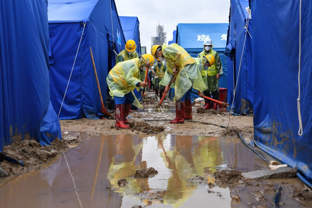 3月23日,一場大雨過后,泥水漫灌進生活區的帳篷,工人們動手挖排水渠。