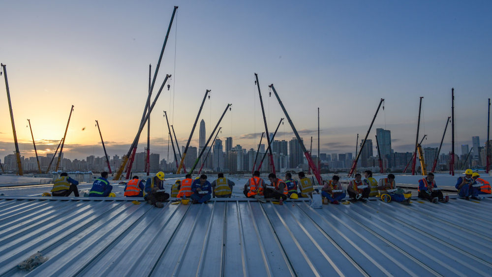 4月8日傍晚,一名工人在應急醫院屋頂施工,他的身后是深圳萬家燈火。