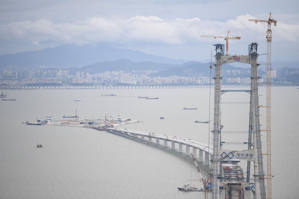 這是2022年6月7日拍攝的深中通道伶仃洋大橋東塔、西人工島及遠處的深圳市區。新華社記者鄧華 攝