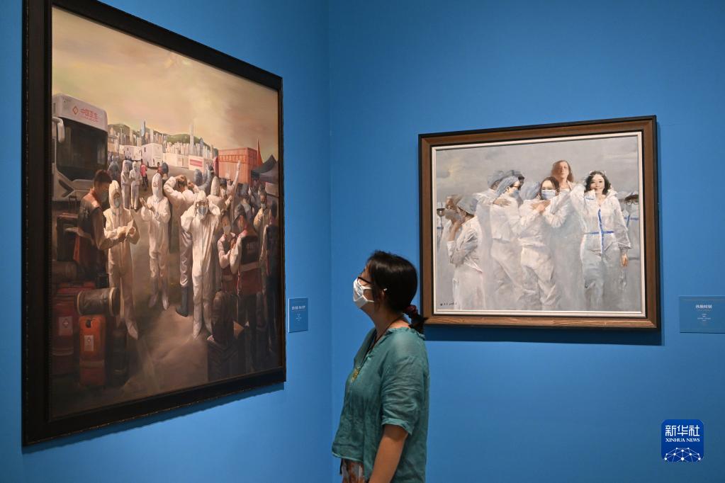 6月24日,參觀者在展覽上觀看作品《逆行出征 同心守護》。 新華社記者 李鑫 攝