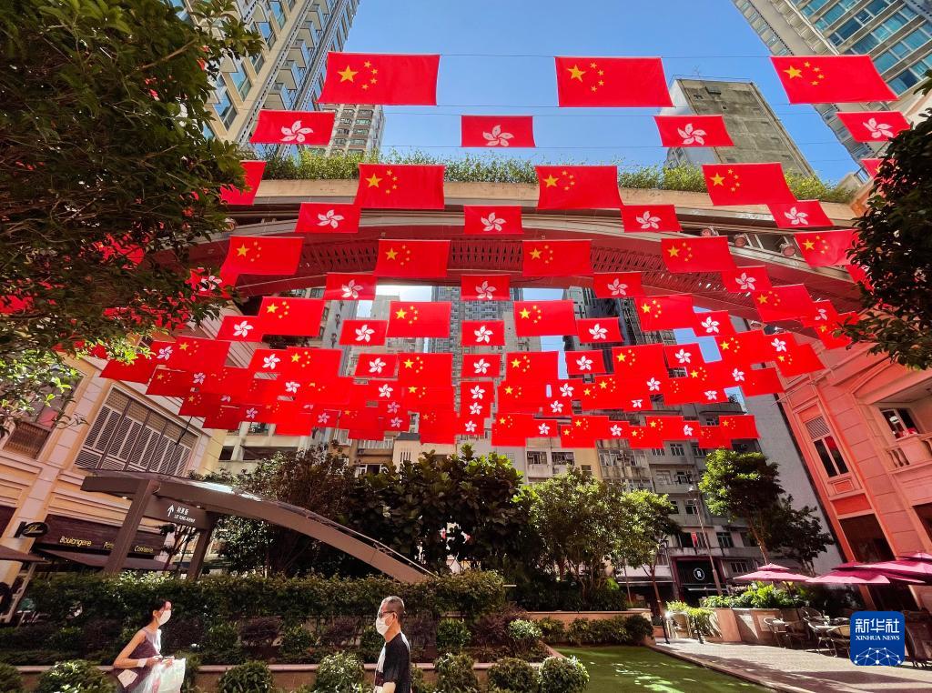 在港島利東街,在九龍尖東街頭及柏麗大道,五星紅旗和紫荊花區(qū)旗掛滿街頭,在藍(lán)天白云映襯下格外鮮艷,路過(guò)的市民抬頭便可見(jiàn)到一片“中國(guó)紅”。不少香港市民拍下照片、視頻發(fā)到網(wǎng)上,受到網(wǎng)友好評(píng):“場(chǎng)景太震撼了”“振奮人心”……