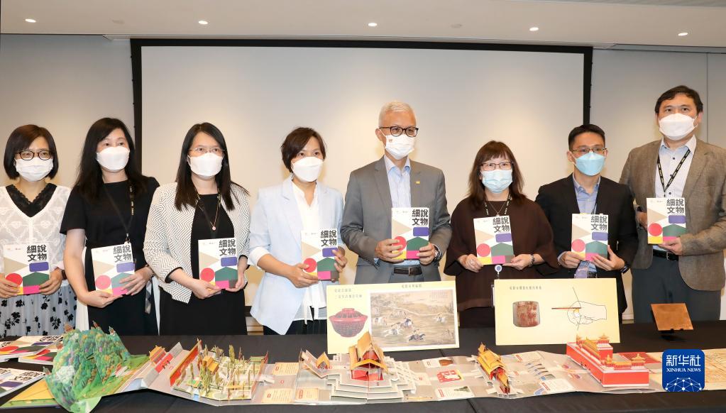 7月18日,香港故宮文化博物館館長吳志華(右四)和來賓一起向記者展示《細說文物——中國歷史教學資源冊》。新華社記者 吳曉初 攝