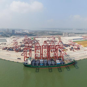 南沙港,世界最繁忙的港口之一。2021年南沙港集裝箱吞吐量完成1766萬標箱,開辟150條外貿航線。從南沙海港大廈頂部俯瞰,潮平海闊,港區盡收眼底。極目遠望,一艘艘輪船出海。