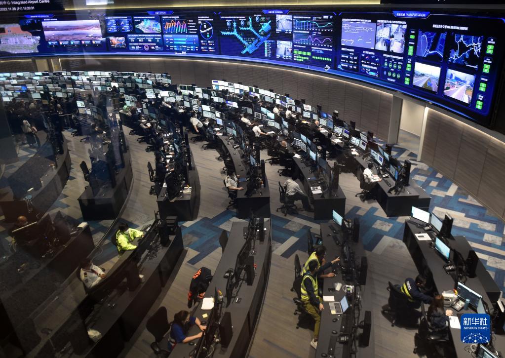 11月25日,在香港國際機場中央控制中心,工作人員觀看航班運作情況。新華社記者 盧炳輝 攝