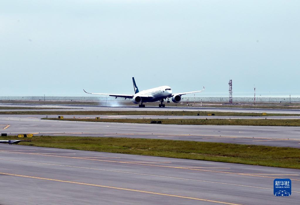 11月25日,一架客機降落香港國際機場第三跑道。新華社記者 盧炳輝 攝