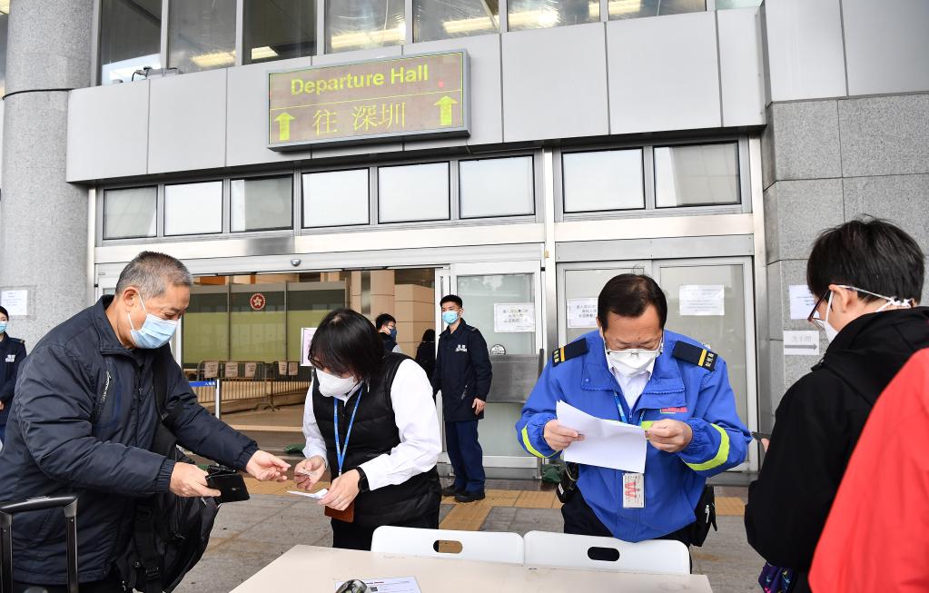 1月8日,香港工作人員在深圳灣口岸查驗(yàn)旅客過(guò)關(guān)手續(xù)資料。新華社記者 陳鐸 攝