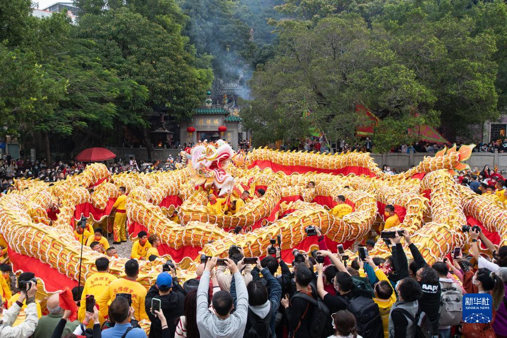 “金龍啟新歲,萬事皆順遂。”大年初一上午,澳門特區政府旅游局舉行金龍巡游喜迎新春活動。早上11時,238米長的大金龍和醒獅隊伍從大三巴出發,財神、福祿壽三星、生肖兔、金童玉女、澳門旅游吉祥物“麥麥”等伴隨穿梭澳門各區,向居民及旅客拜年,派發金元寶裝飾物。金龍所到之處水泄不通,人們都爭相摸一摸金龍圖個好兆頭。
