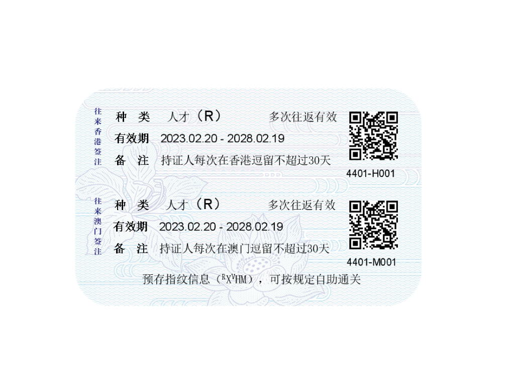 往來港澳人才簽注式樣。(中華人民共和國出入境管理局供圖)