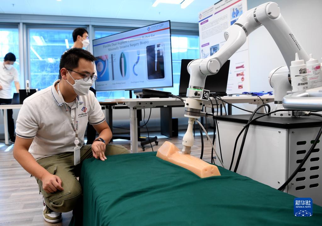 2月17日,醫療科技聯合實驗室“HK MedTech Hub”工作人員在演示醫療技術機器人。新華社記者 陳鐸 攝