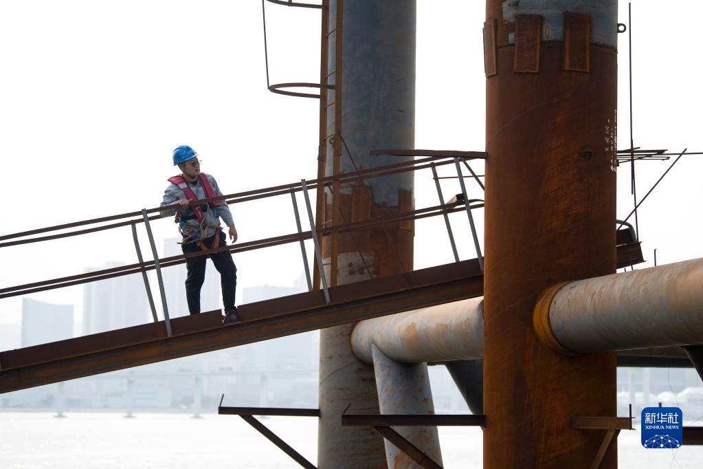 山東鄆城人吳光陽在“四橋”架梁臨時支墩支架現場留影(4月13日攝)。新華社記者 張金加 攝