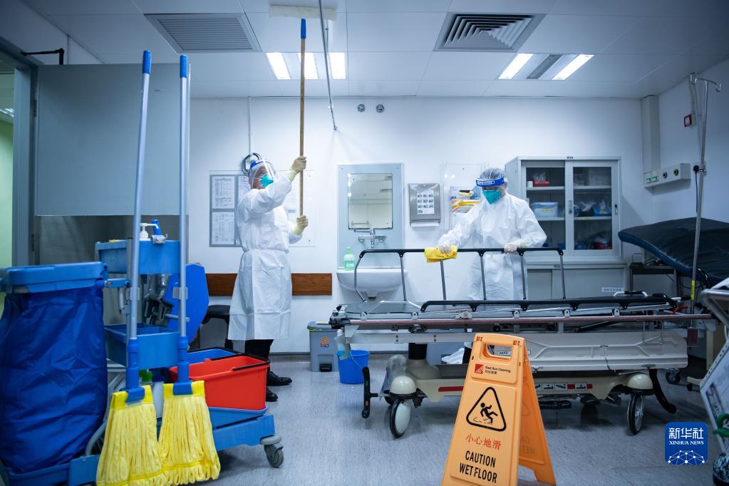湖北麻城人方玲(右)和四川廣安人彭友明在澳門仁伯爵綜合醫院進行清潔服務(4月24日攝)。新華社記者 張金加 攝