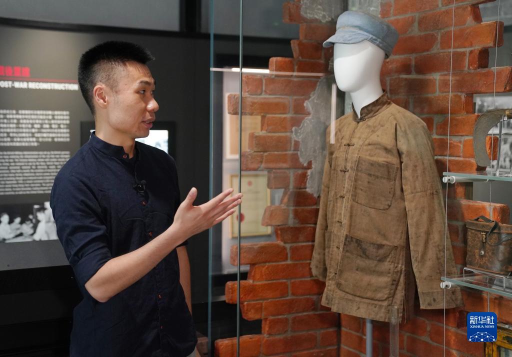 香港海防博物館二級(jí)助理館長(zhǎng)楊汶翹向新華社記者介紹博物館展廳中東江縱隊(duì)港九獨(dú)立大隊(duì)成員抗戰(zhàn)時(shí)的穿戴裝束(8月24日攝)。 新華社記者 王申 攝