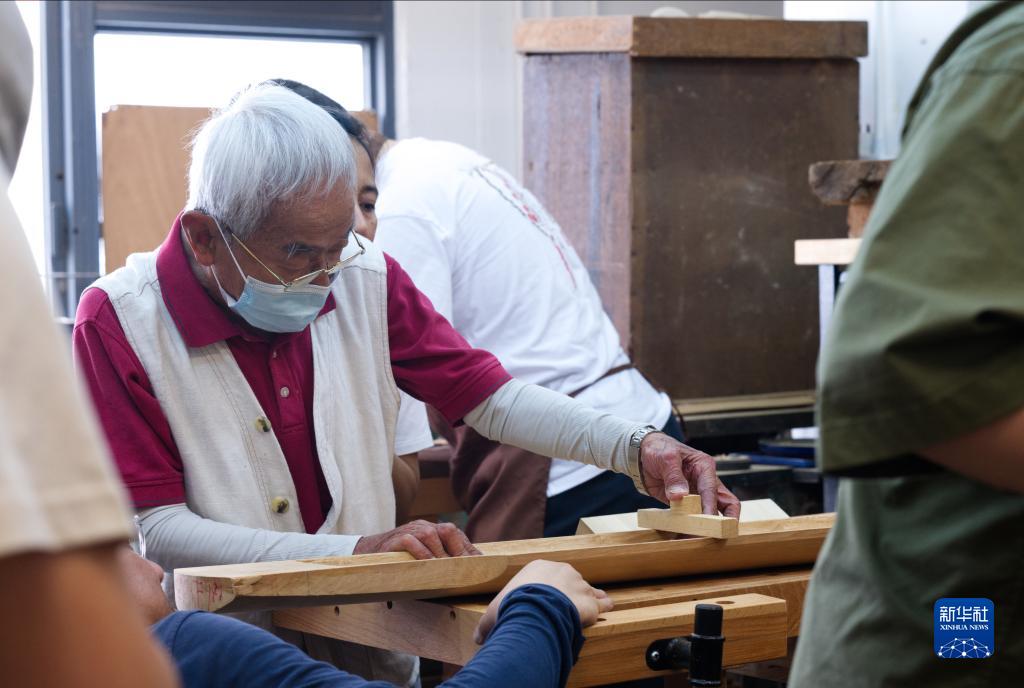 蔡昌壽在指導徒弟制作古琴(4月29日攝)。 新華社發