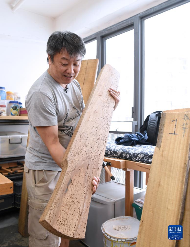 10月7日,徒弟黃良喜介紹一塊琴材。 新華社記者 陳鐸 攝
