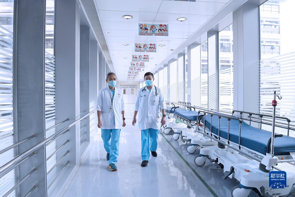 10月12日,匡煜坤(右)與楊耀昌從瑪嘉烈醫院的走廊走過。新華社記者 陳鐸 攝