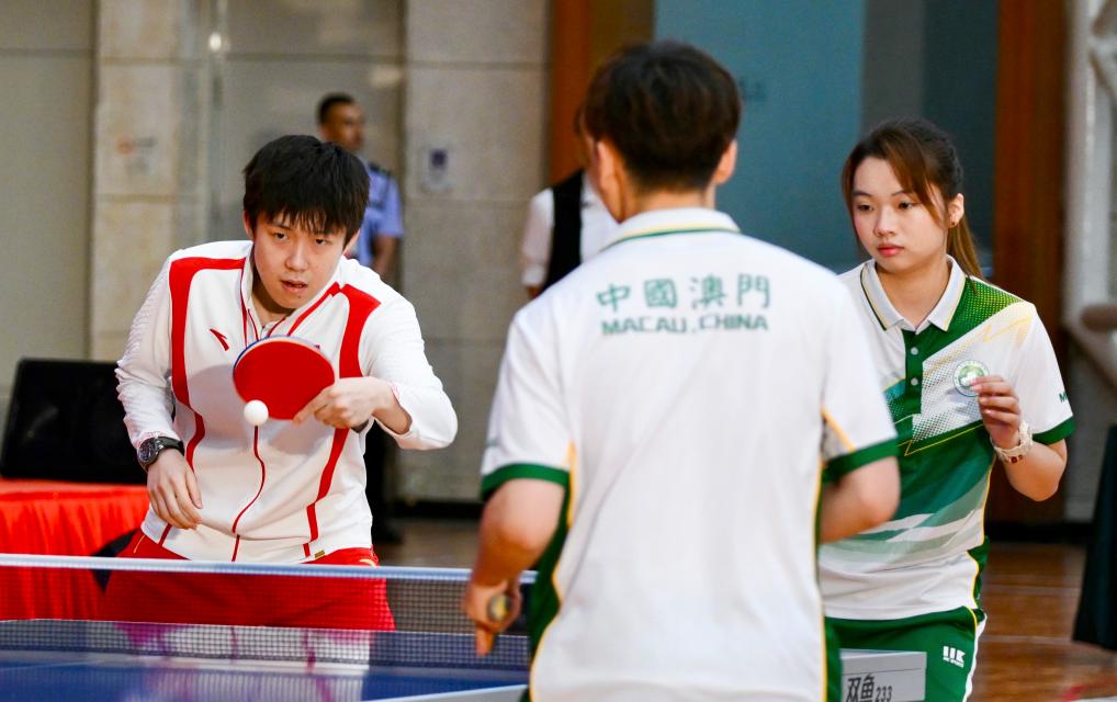 9月1日,乒乓球运动员王楚钦(左)与澳门运动员切磋球技。新华社记者 郭雨祺 摄