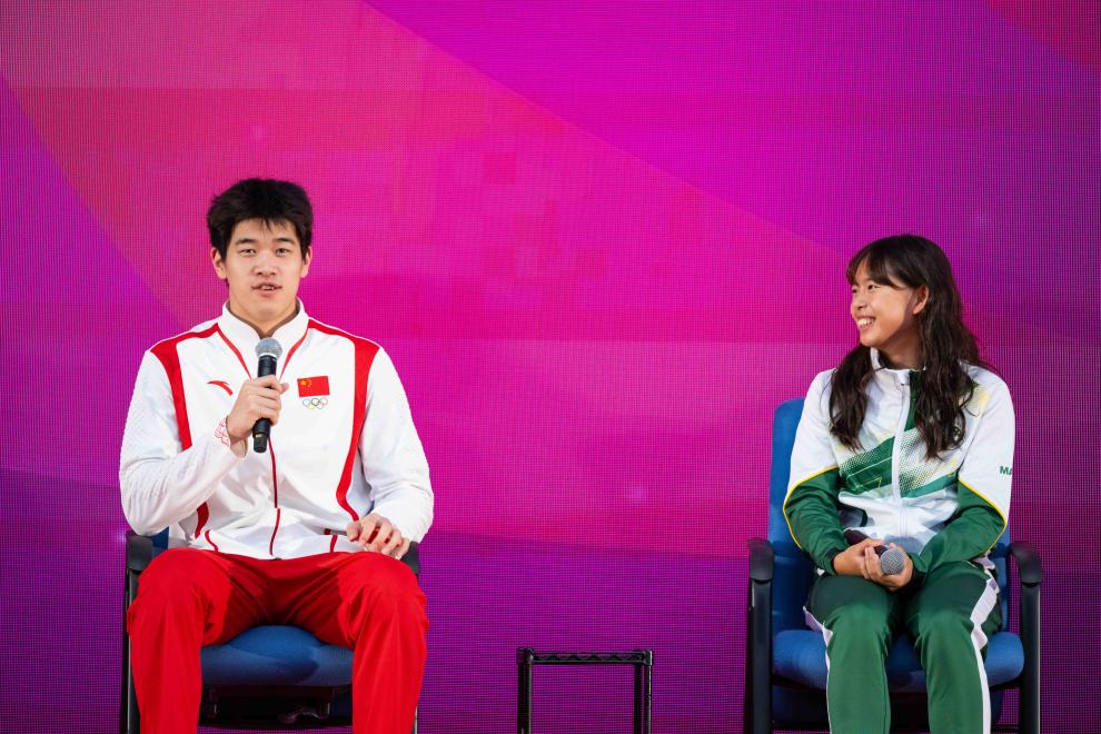 9月1日,游泳运动员潘展乐(左)在活动中回答澳门运动员的提问。新华社记者 张金加 摄