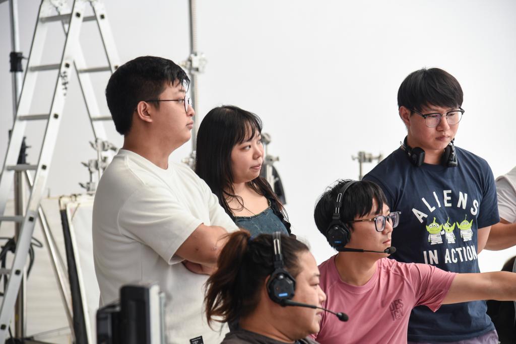 胥力(左一)和黄诗茵(左二)在广州的一间录影棚内和同事赶制宣传视频(9月29日摄)。 新华社记者 洪泽华 摄