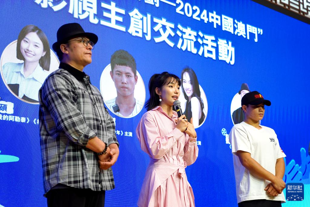 10月9日,网络剧《我的阿勒泰》主演阿丽玛(中)与澳门学生交流。新华社记者 郭雨祺 摄