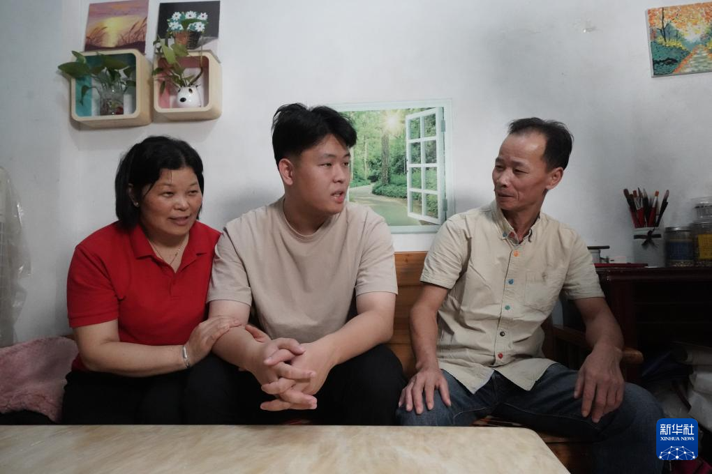 梁志华(右)夫妇和儿子梁松禧(中)在家中闲谈(11月11日摄)。新华社记者 褚萌萌 摄