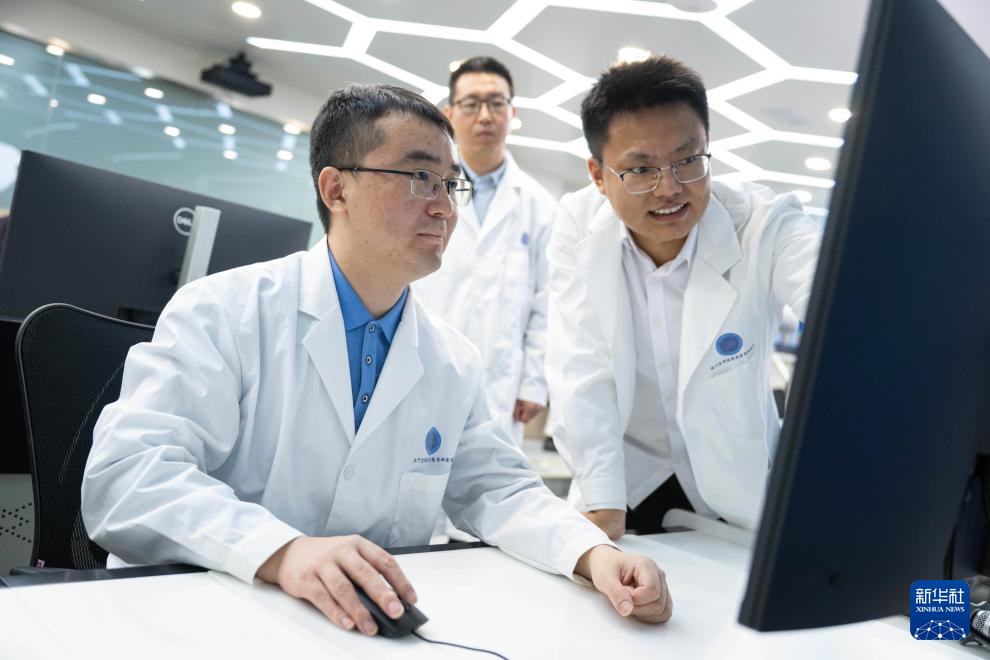 12月4日,“澳科一号”卫星项目助理研究员尹亮(左一)与同事交流。 新华社发(张金加 摄)