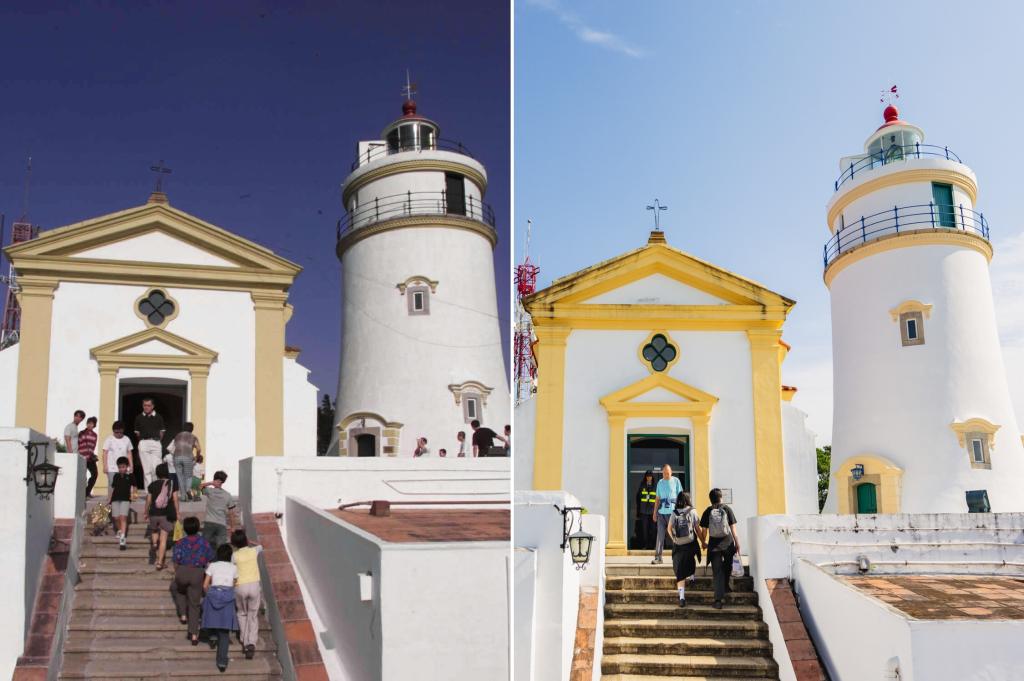 东望洋灯塔和圣母雪地殿教堂(左图摄于1999年,右图摄于2024年)。