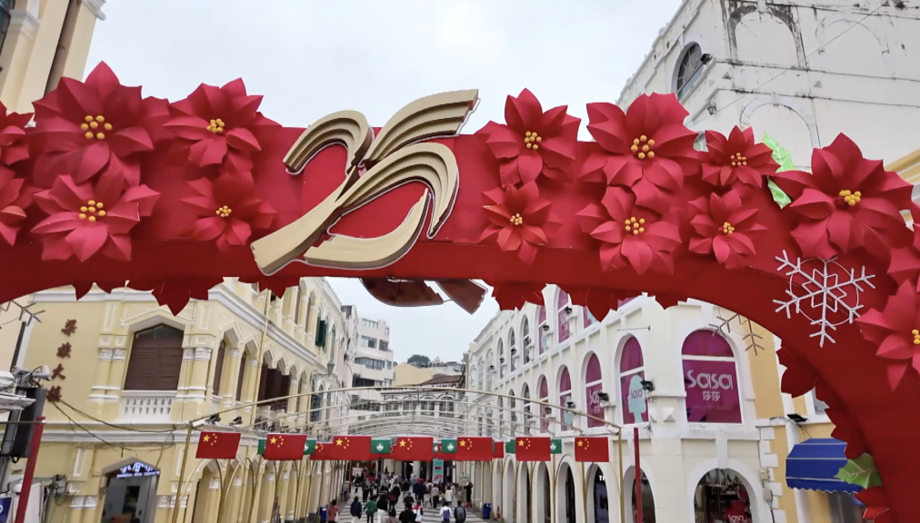 12月的澳门街头,处处洋溢着节日喜庆气氛。在议事亭前地的板樟堂街,国旗和区旗交相辉映;大三巴牌坊前立起庆祝澳门回归祖国25周年的招牌;“回归的旋律”主题花展前游人如织;氹仔旧城区的重要组成街道之一官也街更添喜庆与热闹。