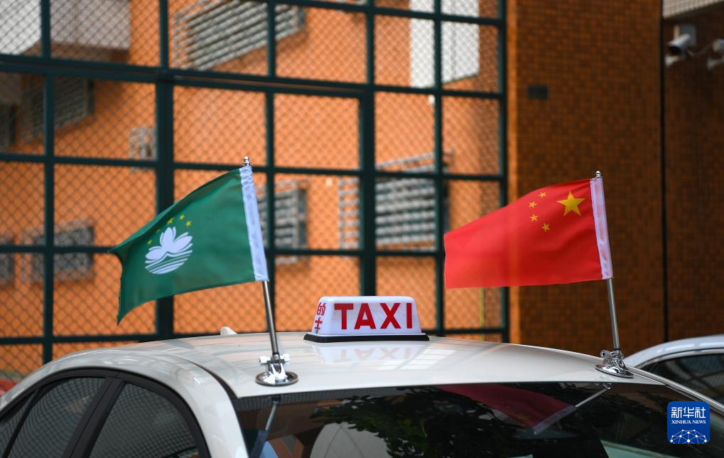 12月20日,一辆澳门出租车上插着国旗和区旗。