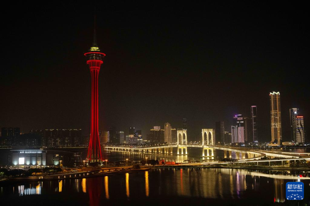 这是12月20日拍摄的澳门旅游塔、西湾大桥一带的夜景。