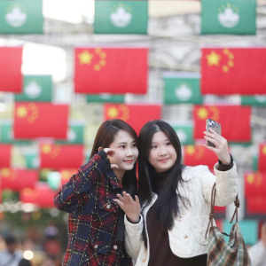 12月20日,游客在澳门街头挥舞国旗和区旗留影。