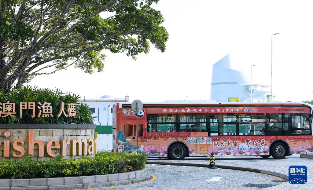 12月20日,一辆涂装庆祝澳门回归祖国25周年标语的公交车在澳门街头行驶。