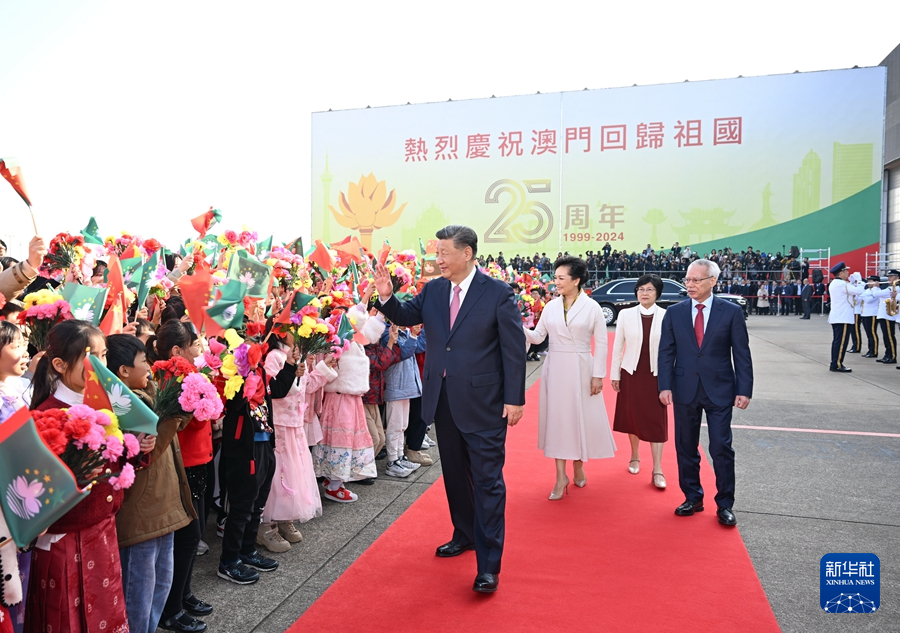 12月20日下午,中共中央总书记、国家主席、中央军委主席习近平圆满结束在澳门的各项活动,乘专机离开澳门。这是习近平和夫人彭丽媛向欢送人群挥手致意。新华社记者 谢环驰 摄