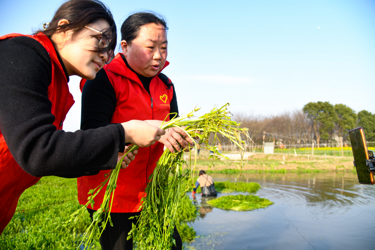 最初的“金斗云”,只是一叶探索数字蓝海的扁舟。农户对线上销售认知匮乏,端木云便从最基础的理念普及做起,走街串巷、进村入户,用通俗易懂的语言向妇女姐妹讲解电商优势。无节水芹作为金坛朱林“一村一品”的特色农产品,曾长期依赖菜贩子收购,销路窄、溢价低。为改变这一现状,端木云带头走进田间地头,以真实的农耕场景为背景开启直播,用活泼的互动、专业的讲解介绍无节水芹的种植特点与营养价值。她还邀请种植高手担任助播,用“土专家”的实战经验增强说服力,让无节水芹逐渐被全国消费者熟知。从店铺注册到订单处理,从产品包装到物流对接,她全程跟踪指导,帮助多名返乡青年投身电子商务创业。如今朱林社区网店经营户已超70多家,其大多为涉农网店47家,形成了抱团发展的电商集群。