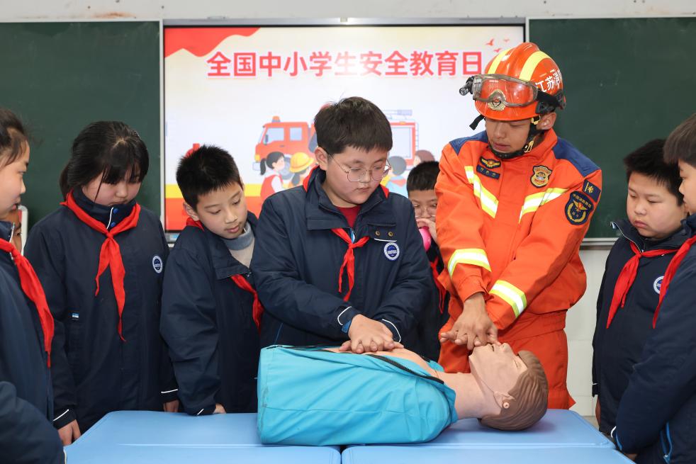 3月30日,在江苏省淮安市洪泽第二实验小学,学生在消防员的指导下体验心肺复苏。
