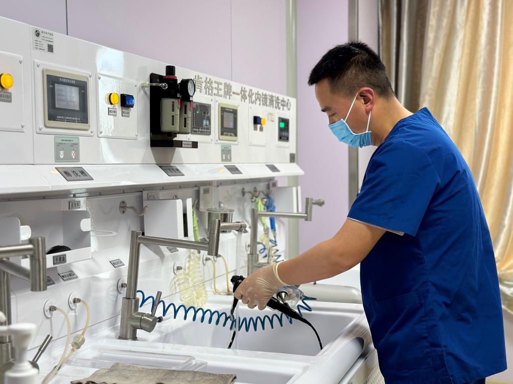 5月10日,韓進海在清潔氣管鏡。新華社記者 張子琪 攝