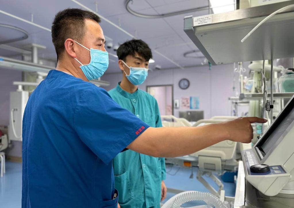 5月10日,韓進海(左)在教護士調節設備參數。新華社記者 李寧 攝