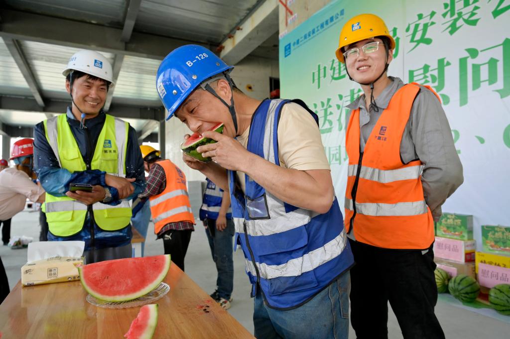6月16日,在北京市經(jīng)開區(qū)的中建二局安裝公司信創(chuàng)園項(xiàng)目舉辦的夏送清涼慰問活動(dòng)上,建筑工人在吃西瓜。新華社記者 才揚(yáng) 攝