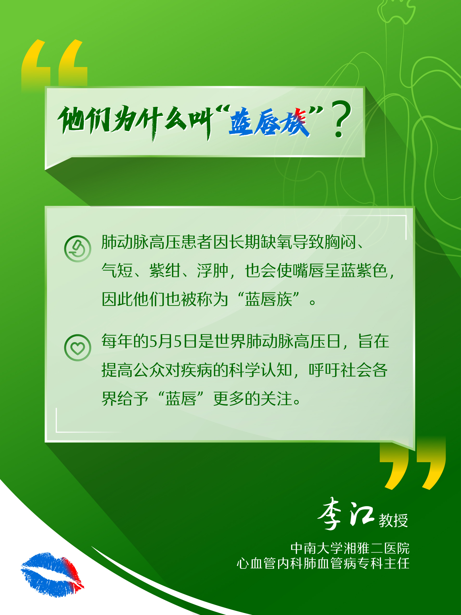 中南大学湘雅二医院心血管内科肺血管病专科主任李江教授呼吁,提高全社会对“蓝唇族”的认识和关注,让联合治疗、尽早达标等规范化诊疗观念惠及更多患者。