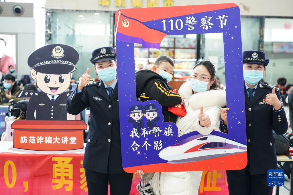 南京鐵路公安處聯合南京市公安局公交治安分局在南京火車站舉行迎接“中國人民警察節”活動,民警和旅客在活動上合影(2022年1月7日攝)。新華社記者 季春鵬 攝