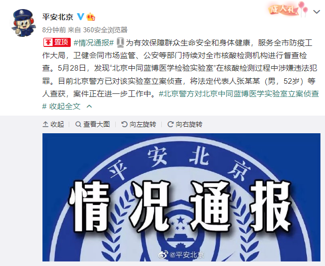 為有效保障群眾生命安全和身體健康,服務(wù)全市防疫工作大局,衛(wèi)健會(huì)同市場(chǎng)監(jiān)管、公安等部門持續(xù)對(duì)全市核酸檢測(cè)機(jī)構(gòu)進(jìn)行督查檢查。5月28日,發(fā)現(xiàn)“北京中同藍(lán)博醫(yī)學(xué)檢驗(yàn)實(shí)驗(yàn)室”在核酸檢測(cè)過程中涉嫌違法犯罪。目前北京警方已對(duì)該實(shí)驗(yàn)室立案?jìng)刹椋瑢⒎ǘù砣藦埬衬常校?2歲)等人查獲,案件正在進(jìn)一步工作中。