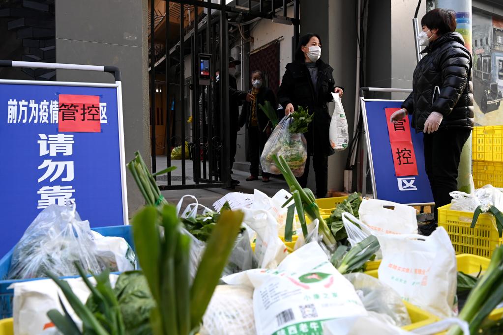 12月29日,西安市新城區(qū)西一路街道通濟(jì)南坊一號院,居民在領(lǐng)取免費(fèi)生活物資。新華社記者 劉瀟攝