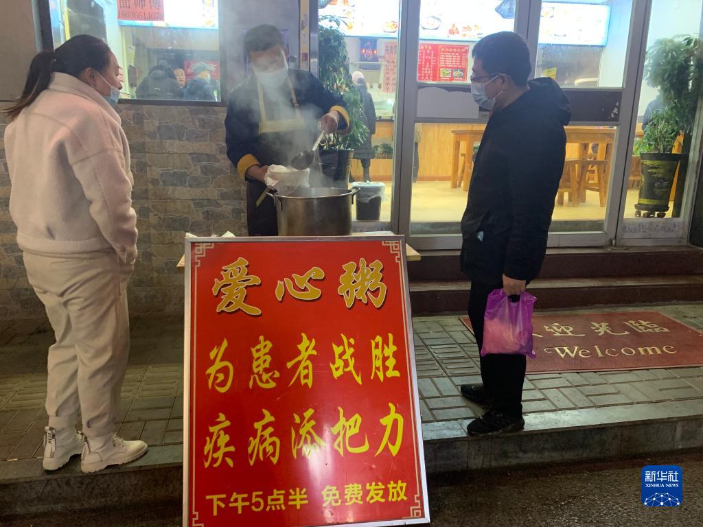 顧客在大強(qiáng)家常菜館外領(lǐng)取愛心粥(1月7日攝)。新華社記者 魏飚 攝
