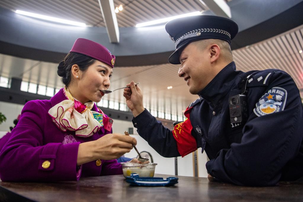 2月15日,祁悅和周幸在待乘室里吃湯圓。新華社記者 唐奕 攝