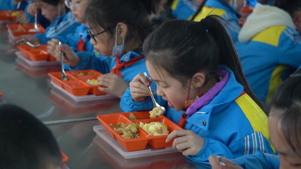 中午十二點,下課鈴聲響起。尚欣怡和同學們排隊走入食堂,坐在餐桌前,端著盛滿紅燒肉的餐盒,嘴角上揚的她綻放出開心的笑容。