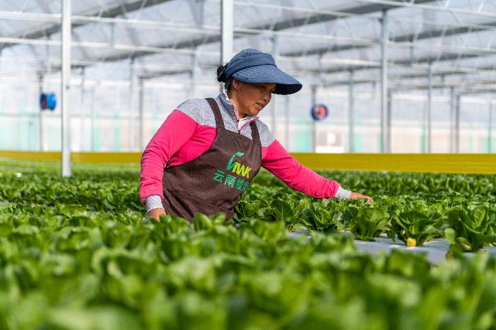一名縣城易地搬遷安置區居民在會澤縣農業產業示范園蔬菜大棚內打理蔬菜。(新華社記者 陳欣波 3月3日攝)