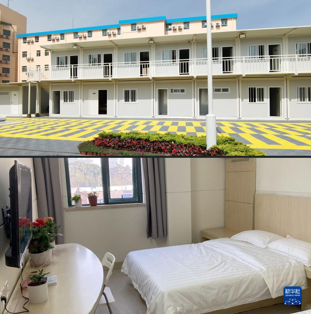拼版照片:陳娟團隊設計的徐匯區(qū)龍耀路方艙的外景(上)與內景(下)(3月16日攝)。新華社發(fā)(受訪者供圖)