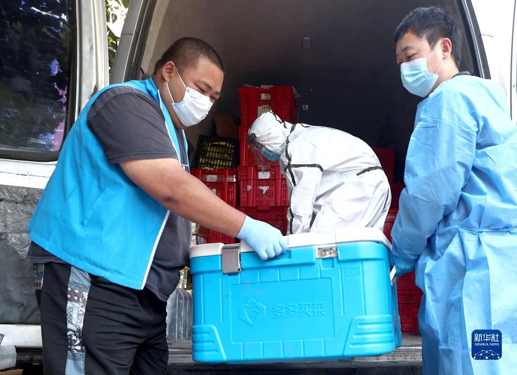 4月17日,李曉俊(左)與志愿者在閔行區(qū)虹梅景苑二街坊卸貨。新華社記者 陳建力 攝
