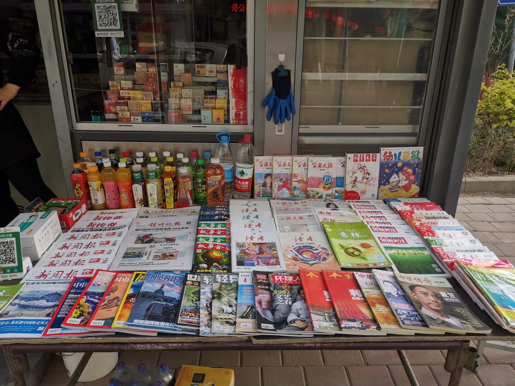 張彥孝經營的報刊亭外簡易桌上鋪滿各種雜志和報紙。新華社記者 許晉豫 攝