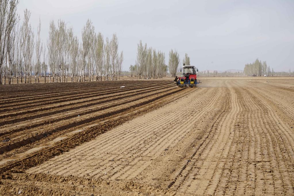 4月12日,農(nóng)機(jī)合作社的工作人員正在耕種烏拉特前旗蘇獨侖鎮(zhèn)的托管土地。 新華社記者侯維軼 攝