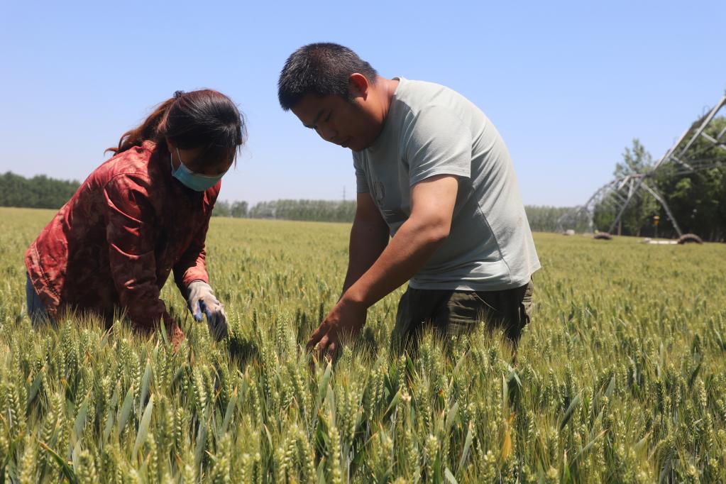5月26日,鄒平市明集鎮種糧大戶正在查看小麥成熟度。(明集鎮供圖)